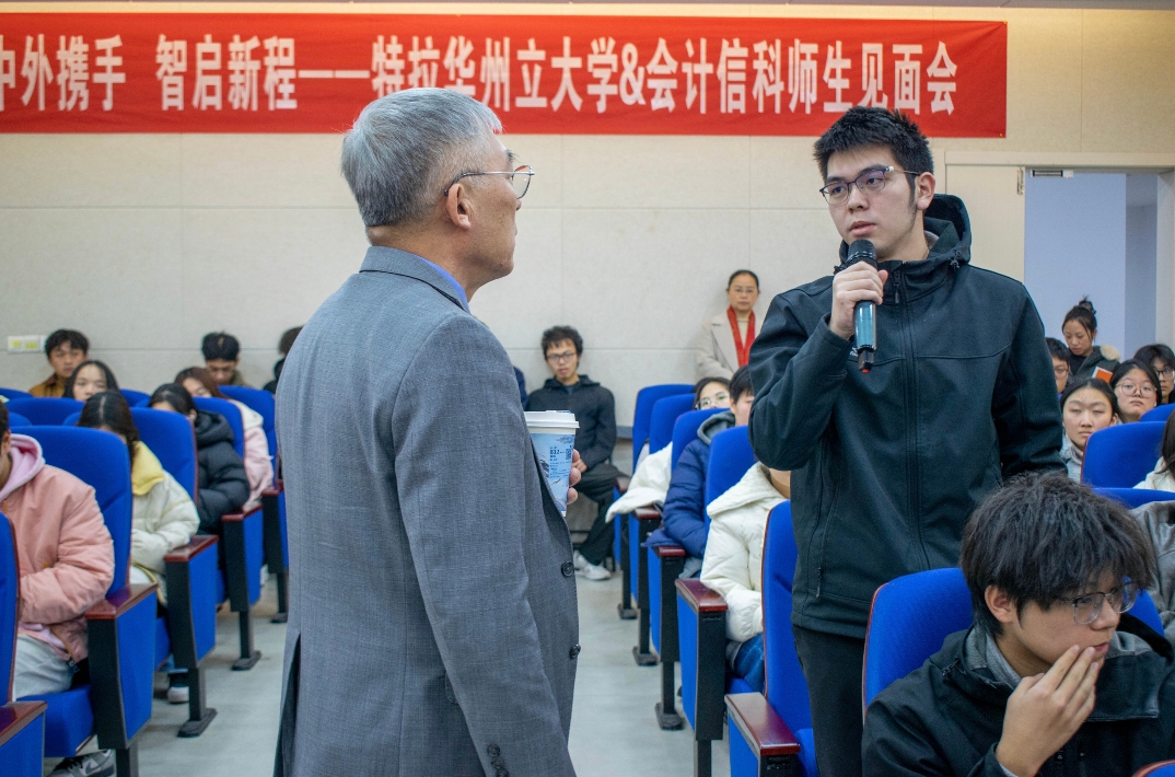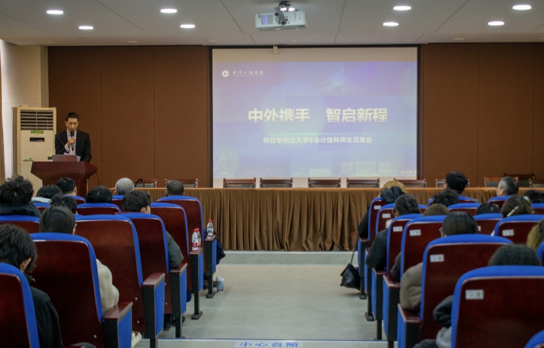 2026年1月12日下午,美国特拉华州立大学战略招生管理与国际事务副校长Kareem McLemore、国际事务办公室国际事务助理副校长刘凤山、卫斯理健康与行为科学学院院长Gwendolyn Scott-Jones和国际事务办公室中国项目协调员于伟远一行到访我校,与会计学(中外合作)、信息与计算科学(中外合作)专业的学子开展面对面交流。见面会由国际处副处长吴昊(主持工作)主持,经管学院和统数学院领导班子参加。