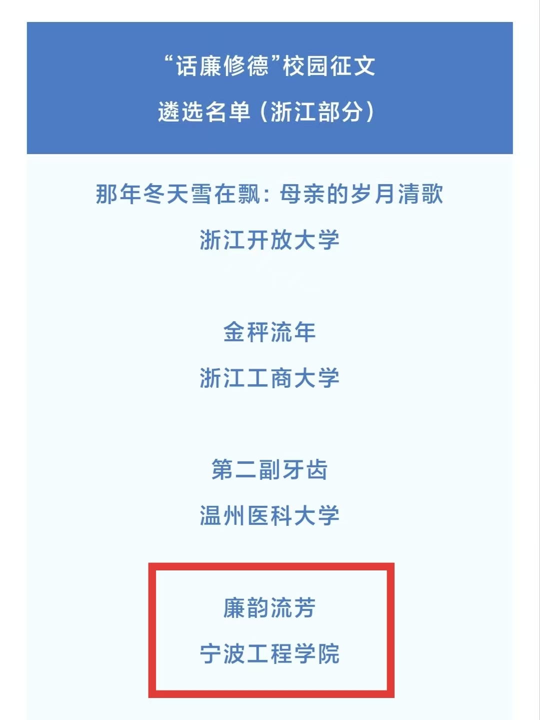 近日,教育部思想政治工作司发布《关于第十届高校廉洁教育系列活动结果的公示》,物管241班任赟的原创诗歌作品《廉韵流芳》在全国高校遴选中脱颖而出,成功入选“话廉修德”校园征文优秀作品,指导老师为张晓雁和李凯磊。